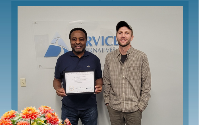 Pictured: Christian Katabana (left) receiving the award from Patrick Layton, Area Manager (right) Congratulations to Christian Katabana, in Residential Services-Snohomish
